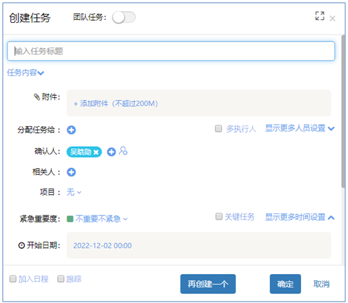 創建團隊任務的入口和方法同上面的任務創建,不同的是創建團隊任務需要把團隊任務的開關打上,如下圖紅色框線區域顯示。