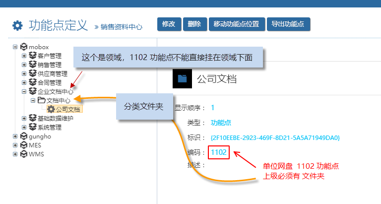 Mobox文檔中心定義 – 1101 及 1102 功能點 注意 2023/09/13 分類:產品中心 實施方案 693 mobox文檔中心可以掛接 1、單位網盤? ? ? ?(1102 功能點) 2、部門網盤? ? ? ?(1102 功能點) 在設置的Mobox文檔中心的時候,功能點不能直接掛到領域下面,而必須在領域下面先建立分類文件夾,之后才能掛接這2個功能點。 若直接掛到領域下面,會出現 而需要改成下圖發設置方法 標簽:方案 上一篇: 低代碼平臺關于數據對象定版后權限控制 下一篇: 關于Gungho及Mobox的授權(臨時授權部分)