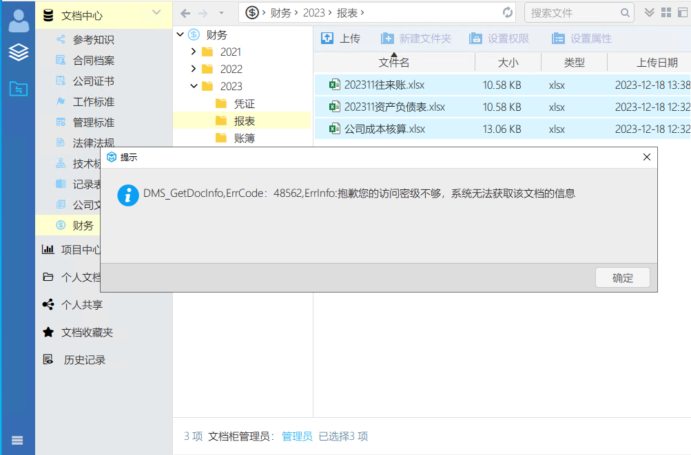 3、有了前兩項(xiàng)設(shè)置后,x用戶登錄后,若其針對(duì)文件夾是具有瀏覽或下載權(quán)限的,但因?yàn)椋瑇用戶的涉密等級(jí)不夠,從而不能瀏覽或下載超過其涉密的等級(jí)的文件。