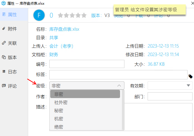 2、通過Mobox文件系統(tǒng)上傳的文件,管理員需要設(shè)置文件的涉密等級(jí)(所有等級(jí))。