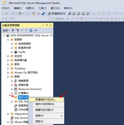 2、在對象資源管理器列表中展開“管理”選項(xiàng)卡,右鍵單擊“維護(hù)計(jì)劃”>“新建維護(hù)計(jì)劃…”