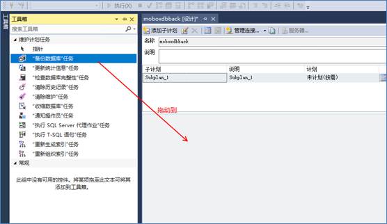 3、點(diǎn)擊上方欄的工具箱,選擇“備份數(shù)據(jù)庫任務(wù)”,用鼠標(biāo)左鍵點(diǎn)住并將其拖到右側(cè)空白處,然后雙擊該任務(wù)