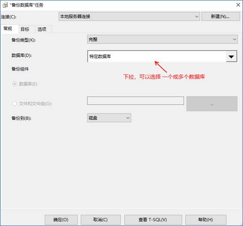4、在彈出窗口中,先選擇“備份類型”(完整/差異/事務(wù)日志),然后選擇您要備份的具體一個或多個數(shù)據(jù)庫。如您所見,您可以選擇備份所有數(shù)據(jù)庫、系統(tǒng)數(shù)據(jù)庫、用戶數(shù)據(jù)庫和特定數(shù)據(jù)庫。之后再選擇一個用于存放此備份的目標(biāo)路徑,點(diǎn)擊“確定”