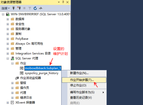 7、設(shè)置完畢之后,返回對象資源管理器,然后依次展開“SQL Server代理”>“作業(yè)”,找到剛剛創(chuàng)建的SQLserver定時備份數(shù)據(jù)庫任務(wù)并右鍵單擊它,選擇“作業(yè)開始步驟”以啟動此任務(wù)