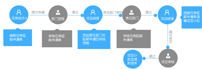 復雜計劃變更流程是一個比較嚴謹?shù)挠媱澴兏^程,首先計劃的變更肯定是由某一個任務或多個任務的延期造成計劃無法滿足預期,需要變更。因此,首先任務的執(zhí)行人提出任務延期申請,并說明原因、指出造成延期的責任部門,要求延期多少天。這些申請首先會到執(zhí)行人所在的部門,得到部門負責人的認可,然后這些申請才會到項目經(jīng)理。由項目經(jīng)理發(fā)起多部門的延期任務申請確認,通過后由項目經(jīng)理根據(jù)任務延期申請單里的信息改進項目計劃,然后走審核流程通過后項目計劃變更完成