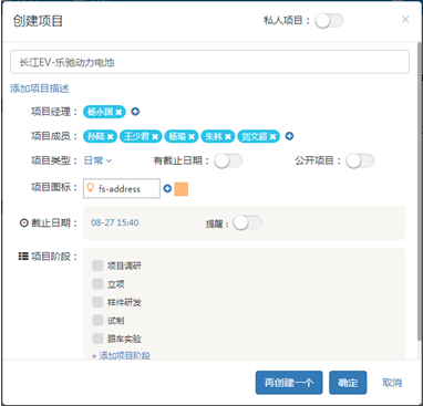 項目名稱、項目內(nèi)容描述、項目周期、項目經(jīng)理、項目成員、項目階段、項目內(nèi)權(quán)限配置、項目內(nèi)相關(guān)審核流程配置等。設(shè)置好后,保存后項目建立。項目成立后系統(tǒng)會通過我們的企業(yè)內(nèi)部通訊系統(tǒng)項項目成員發(fā)送消息進行提醒。