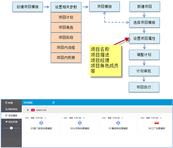 有些企業(yè)項目實施相對比較規(guī)范或標準,其項目計劃、相關(guān)權(quán)限設(shè)置、流程設(shè)置、階段設(shè)置等都非常相似。新項目可能主要就變更了一下人員。這類項目,我們實現(xiàn)可以建立項目模版,在項目模版內(nèi)將項目核心參數(shù)(如:項目計劃、項目權(quán)限、階段等)都先建立好,生成項目模版。新項目的時候,可以通過套用項目模版來新建項目。