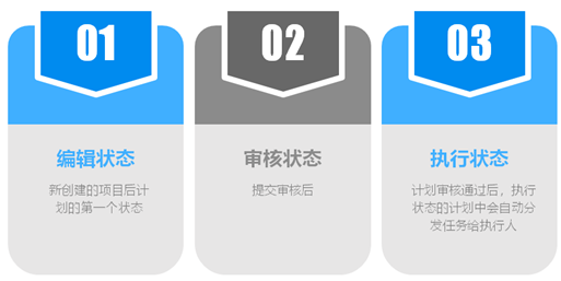 項目計劃中創(chuàng)建的任務并不能馬上執(zhí)行,必須要通過審核后系統(tǒng)才能觸發(fā)任務下達。項目計劃有以下3個狀態(tài)